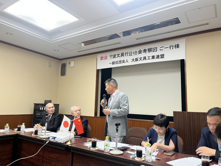 当天下午,考察团核心行程落地大阪文具工业联盟,与联盟理事长、樱花 Craypas 株式会社会长西村贞一,及樱花株式会社、不易糊工业控股有限公司等知名企业负责人展开深度座谈,会议由大阪文具工业联盟专务理事桥本章男主持。西村贞一特意展示 2004 年与宁波文具行业协会首任理事长邱智铭的会面照片,强调两地行业数十年的合作基础。座谈中,许观良指出,日本文具企业的技术与品牌优势,与宁波文具产业的制造根基、完整产业链形成极强互补性,提议双方在产业链配套、新材料联合研发、技术瓶颈突破等领域深化合作。宁波美博进出口有限公司董事长、协会副理事长梅飞珍还介绍了宁波文具产业发展历程、协会工作及亚太文具协会联盟常设秘书处的职能,引发日方企业高度关注。最终,双方围绕协会服务、产品创新、品质标准对接、市场合作模式达成共识,明确将在文化创意开发、展会资源共享等方向推进后续合作。此次交流也是宁波文具行业协会作为亚太文具协会联盟常设秘书处,首次与大阪文具工业联盟对接,为亚太地区文具产业协同发展搭建关键桥梁。